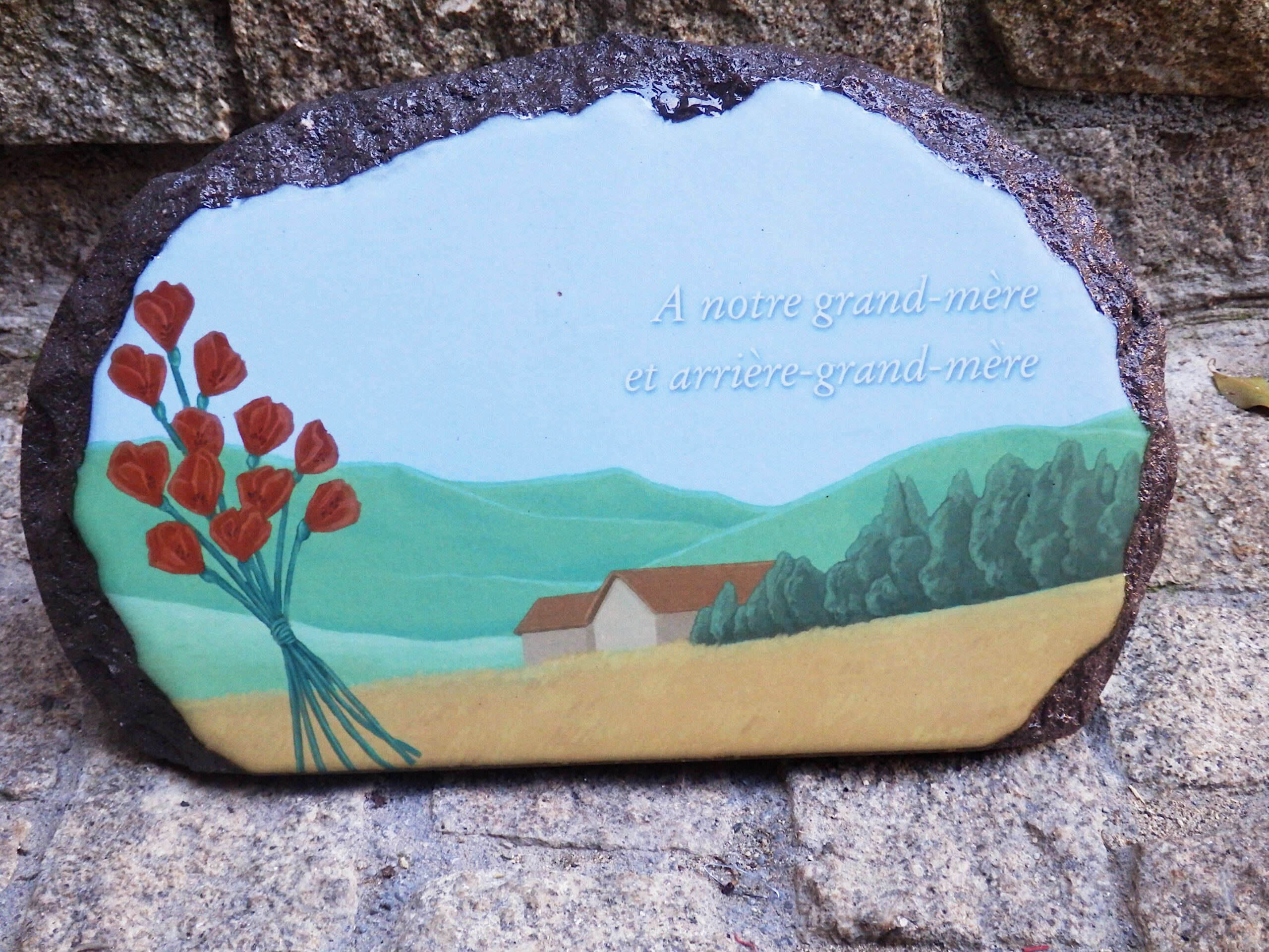 Plaque funéraire en pierre de lave émaillée avec décors champêtre et fleurs rouges (photo par L’île o Pierres).
