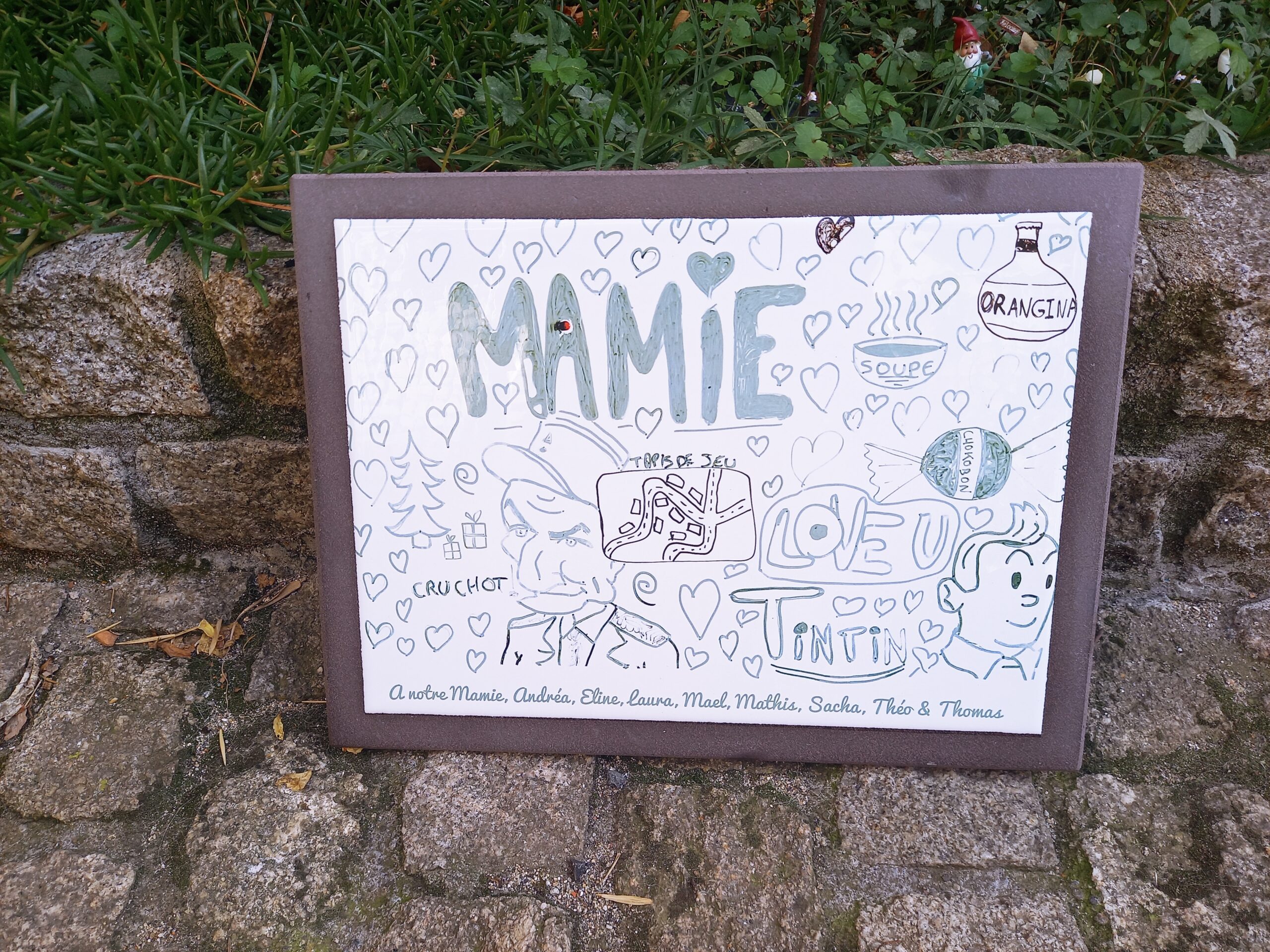 Plaque funéraire en pierre de lave émaillée avec une reproduction de textes et dessins réalisés sur un tableau blanc et photographiés fournis par le client (photo par L’île o Pierres).