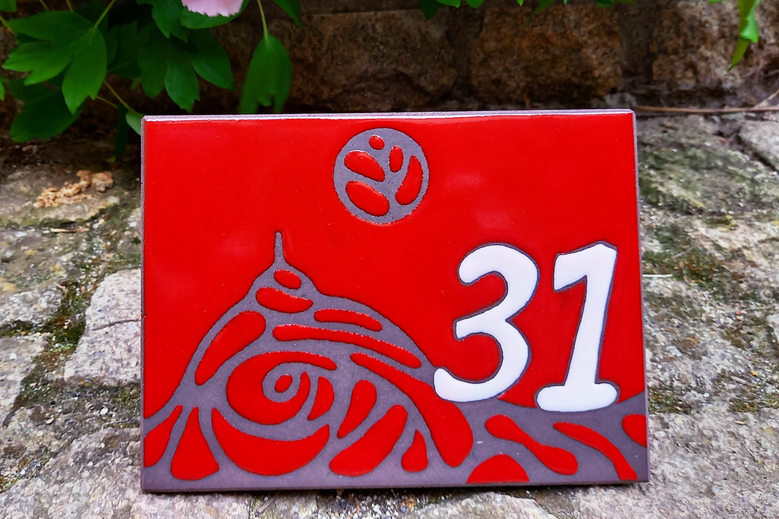 Numéro de maison 31 en pierre de lave émaillé blanc sur fond rouge avec puy de Dôme stylisé pierre (photo par L’île o Pierres).